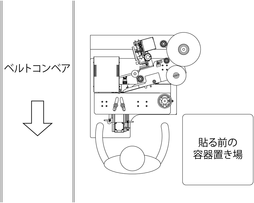 使い方は、ラベラーの右側にラベルを貼っていない容器のケースを置き、ラベラーの左側に市販コンベアが流れており、ラベルを貼った容器をコンベアに置くという使い方をされています。